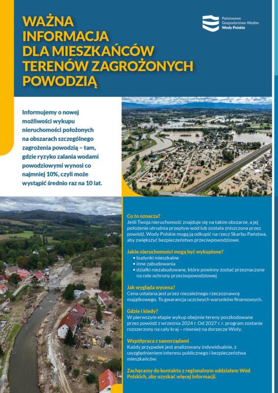 Informujemy o nowej możliwości wykupu nieruchomości położonych na obszarach szczególnego zagrożenia powodzią – tam, gdzie ryzyko zalania wodami powodziowymi wynosi co najmniej 10%, czyli może wystąpić średnio raz na 10 lat.