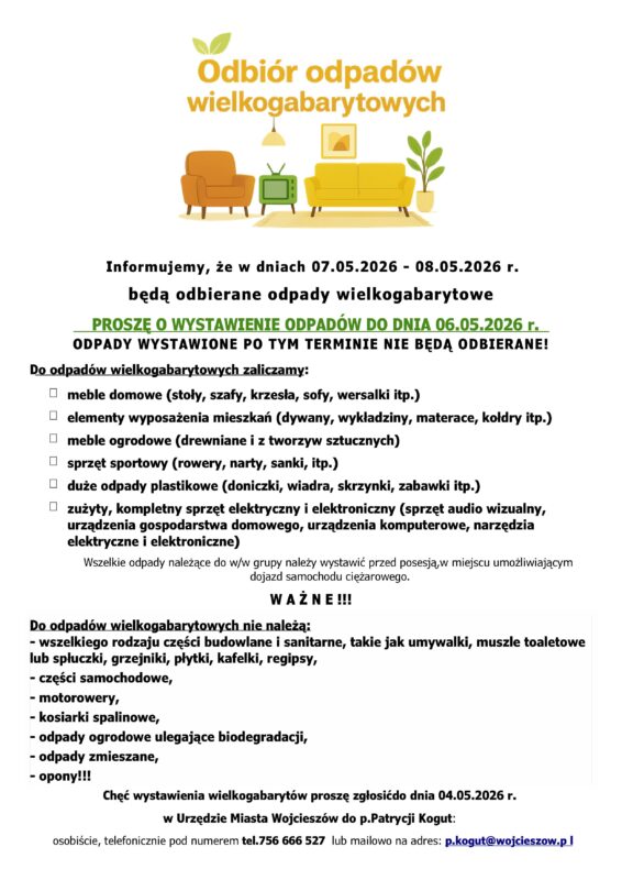 WYWÓZ ODPADÓW WIELKOGABARYTOWYCH 7-8 maja 2026 r.