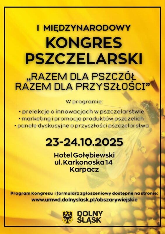 Urząd Marszałkowski Województwa Dolnośląskiego zaprasza do udziału w I Międzynarodowym Kongresie Pszczelarskim, który odbędzie się w dniach 23-24 października w Hotelu Gołębiewski w Karpaczu.